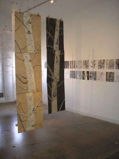 Installation View (Hanging Aspen Panels and drawings from Winter Into Spring series)