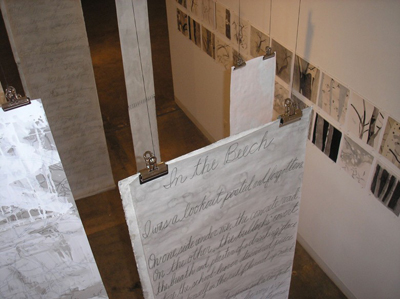 Installation View (Poetry on back of Hanging Aspen Panels) Clearing, Ironton Studios and Gallery, Denver, CO, 2008.